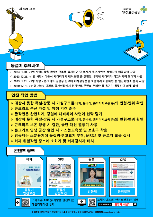 본 저작물은 안전보건공단에서 2024년 작성하여 공공누리 제2유형으로 개방한 '키메세지(12월_동절기 재해예방)'을 이용하였으며, 해당 저작물은 안전보건공단(www.kosha.or.kr)에서 무료로 다운 받으실 수 있습니다.